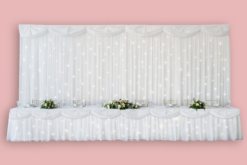 Our twinkling backdrop looks so pretty behind a top table or on a dance floor and we can also provide a matching top table sparkle skirt and cake table sparkle skirt to really complete the look.